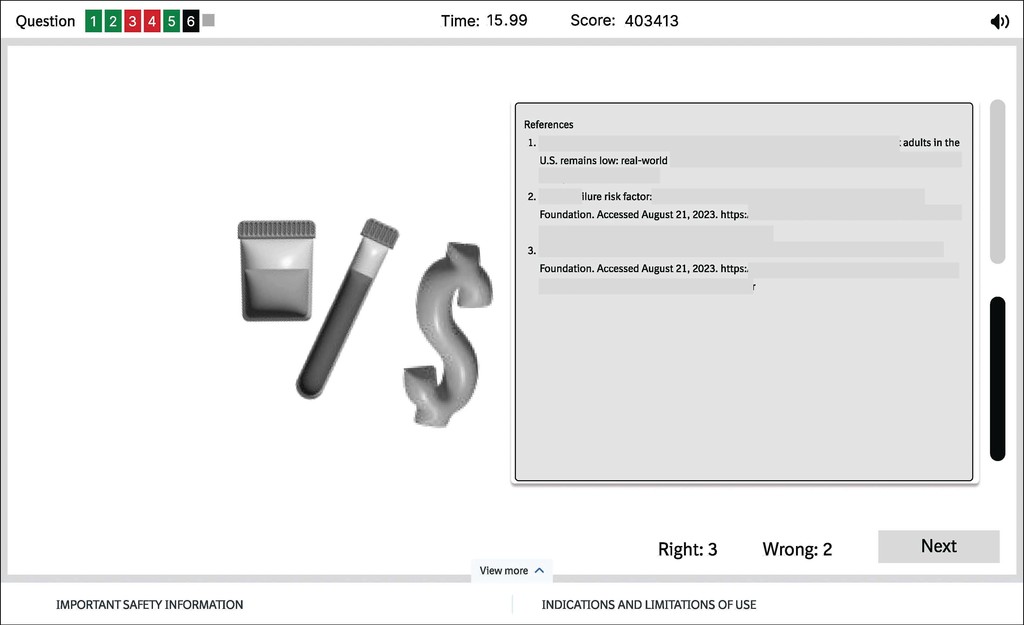 To enhance interactivity, the game includes a countdown timer and animation effects. As time runs down, a background animation gradually expands, creating a sense of urgency. If the countdown ends before the questions are completed, the player must restart the game. This design aims to engage HCPs in a learning experience that deepens their understanding of the new drug in an interactive format.