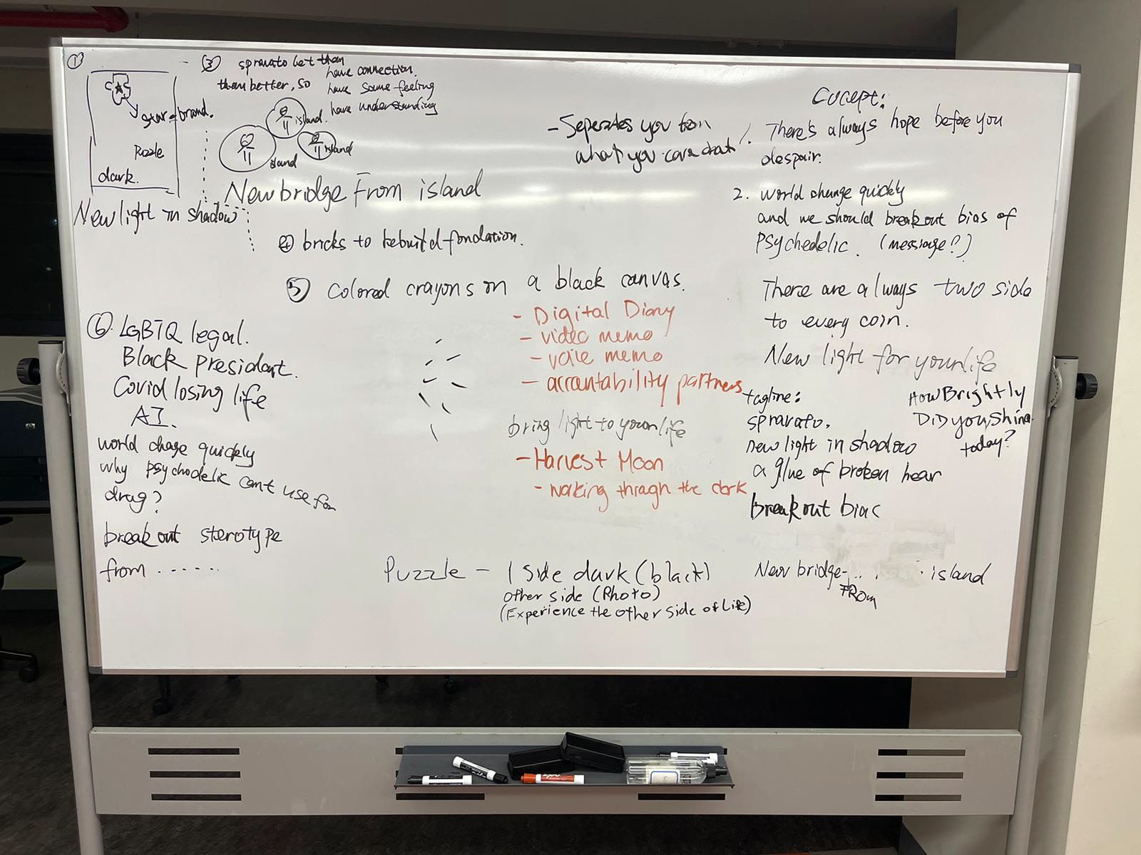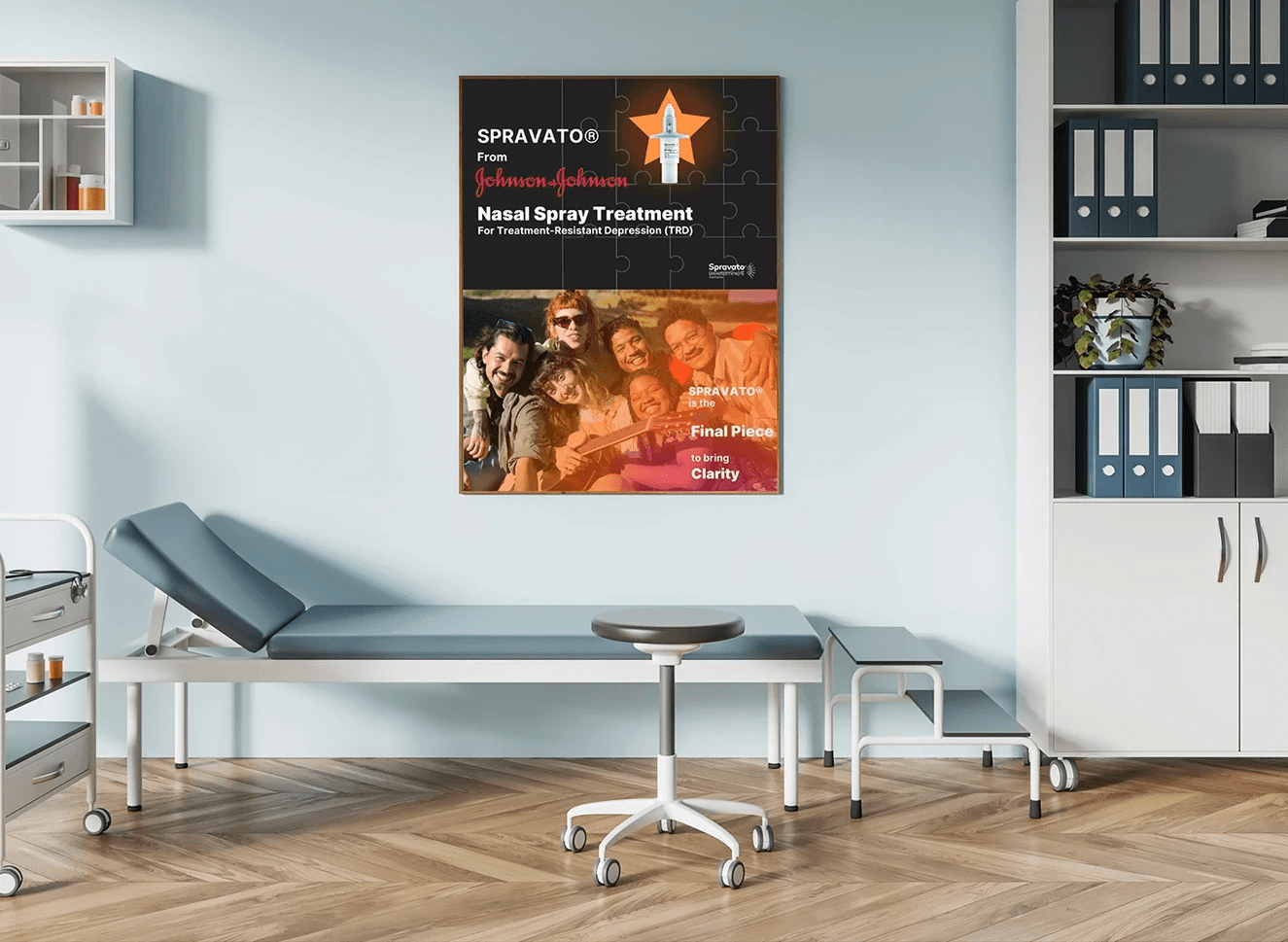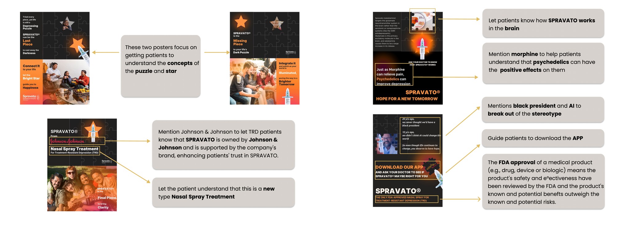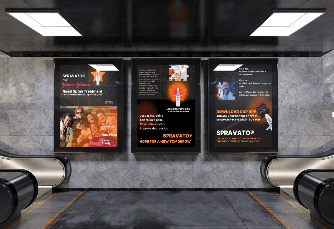 I used the concept of a PUZZLE to represent life with depression, with the missing pieces symbolizing the darkness and pain patients experience. To convey hope and healing, we included a shining STAR as a guiding light. Spravato became the final piece of the puzzle, completing the picture and symbolizing the pursuit of happiness.